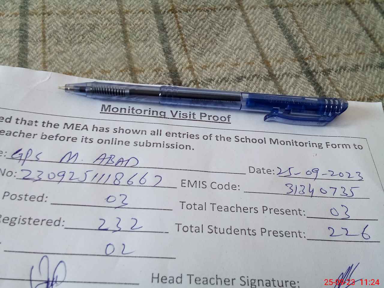 | Attendance Register | Head Teacher | MEA with School | Visit Proof |