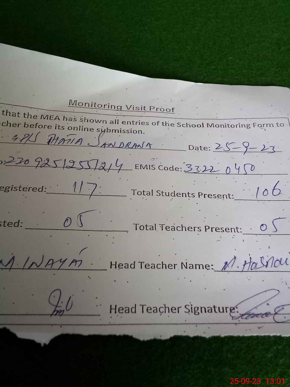 | Attendance Register | Head Teacher | MEA with School | Visit Proof |