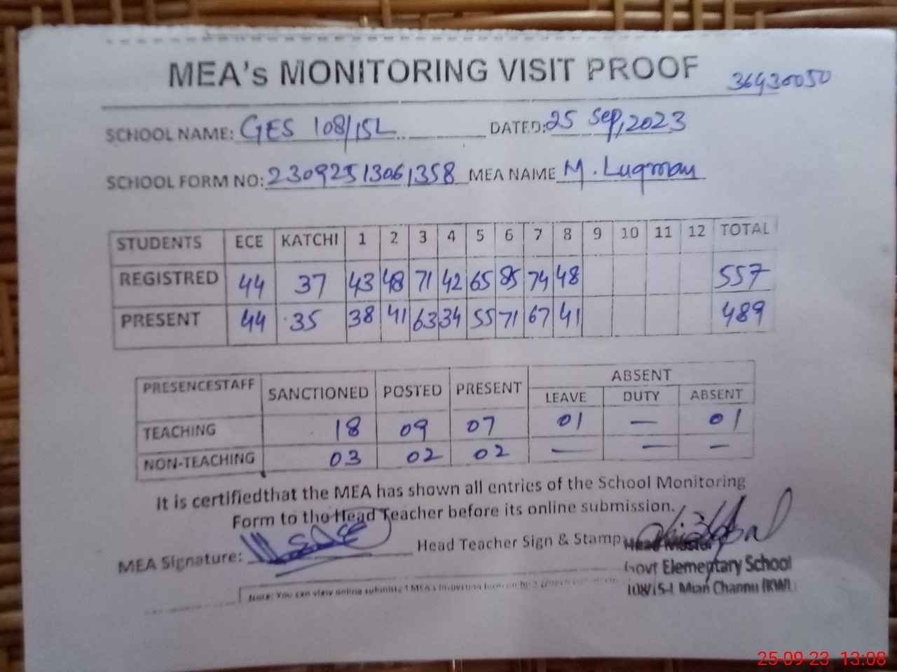 | EMIS Code: 36430050 | Name of School: GES 108/15-L, MIAN CHANNU | |||