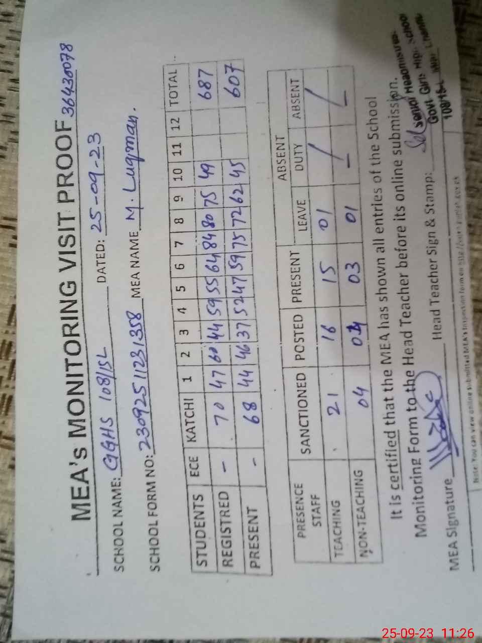 | Attendance Register | Head Teacher | MEA with School | Visit Proof |
