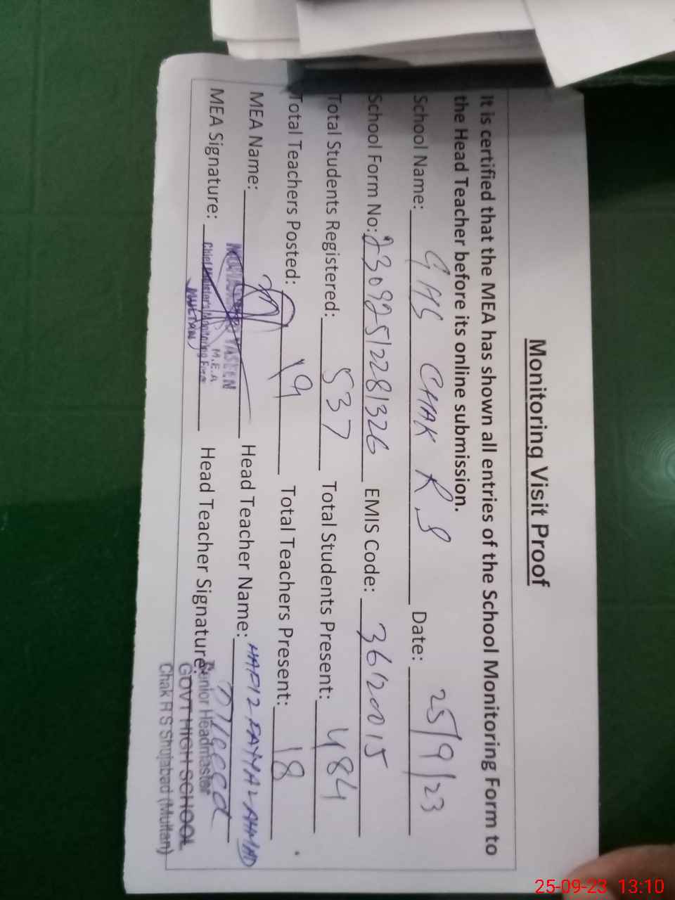 | Attendance Register | Head Teacher | MEA with School | Visit Proof |