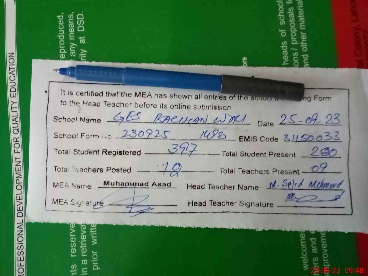 | Certified that this School was Inspected by the Undersigned MEA/DMO Today and the Information Stated Above is as Per Record. | |||||