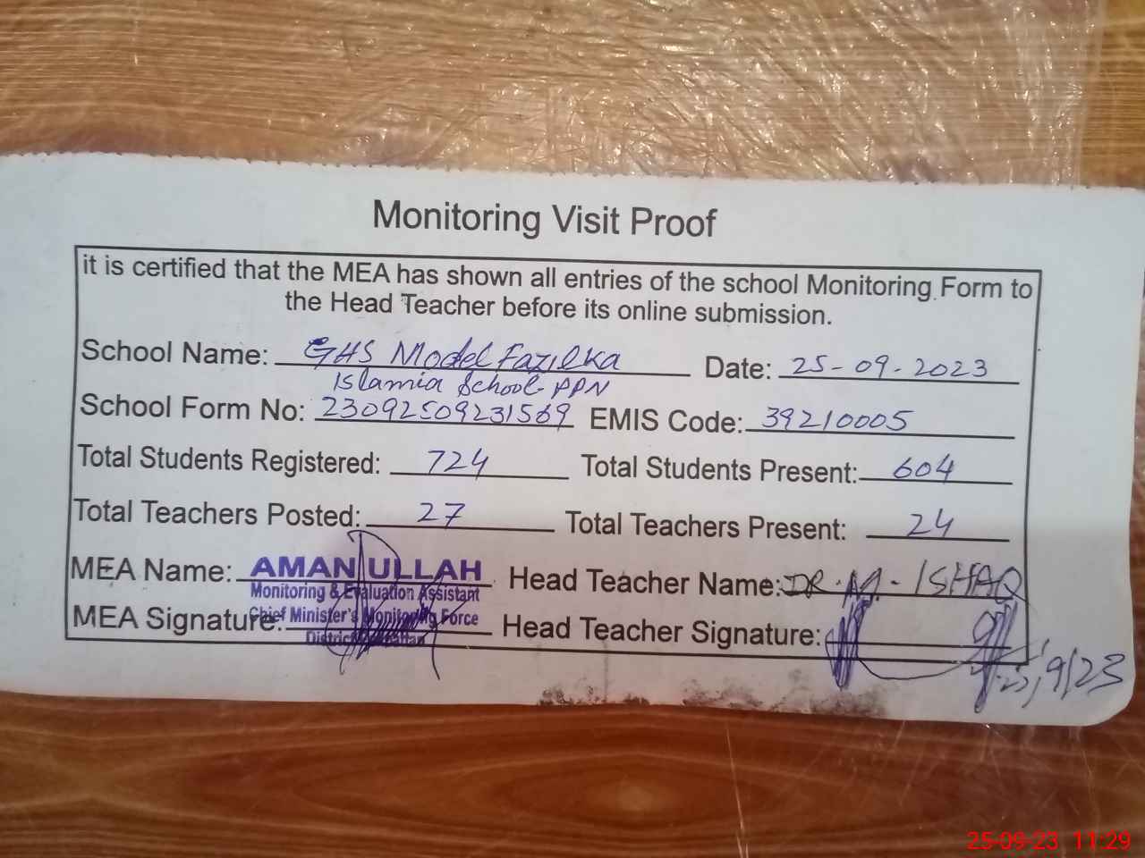 | EMIS Code: 39210005 | Name of School: GHS (MODEL) FAZILKA ISLAMIA PAKPATTAN | |||