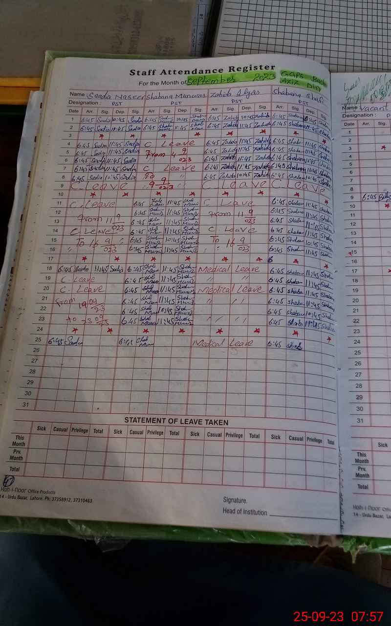 | Remarks (Use Separate Page if Required): PST Zahida Ilyas marked absent as her sanctioned leave not produced at the time of inspection | |||||