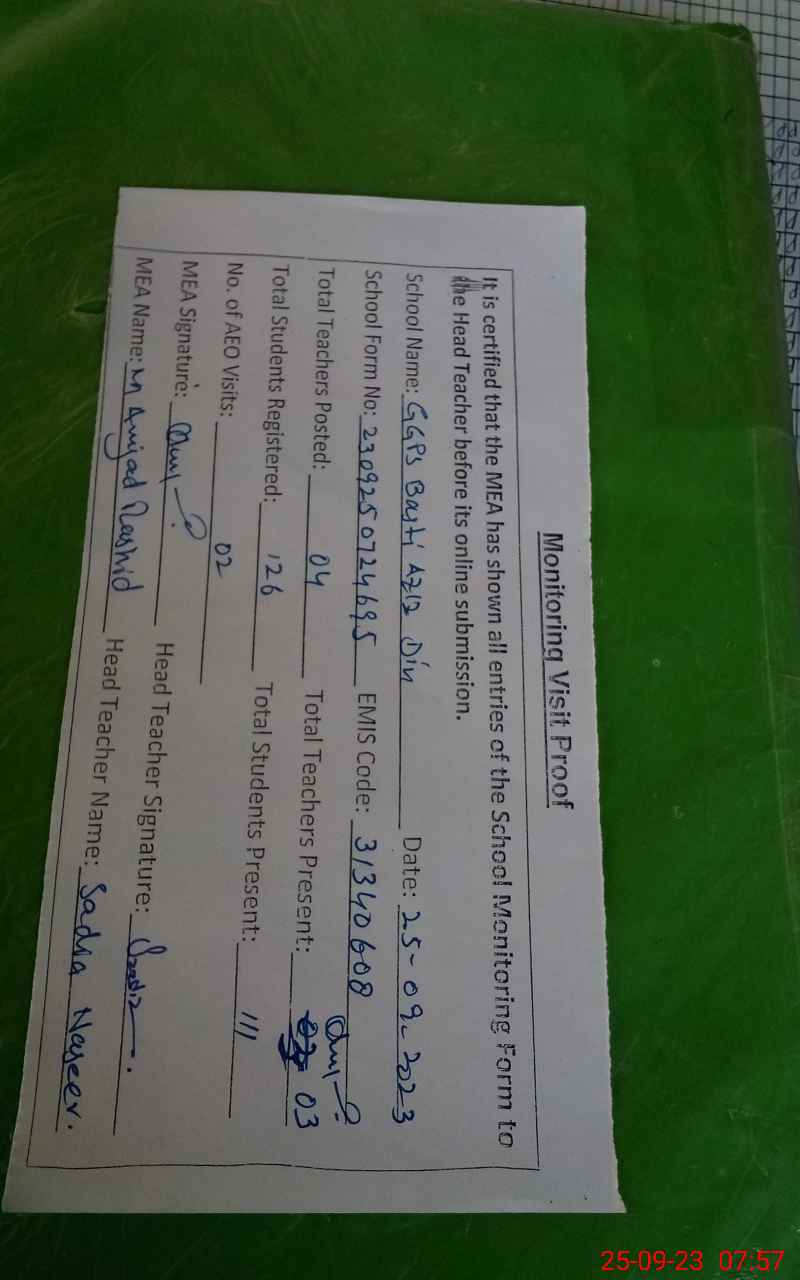 | Attendance Register | Head Teacher | MEA with School | Visit Proof |