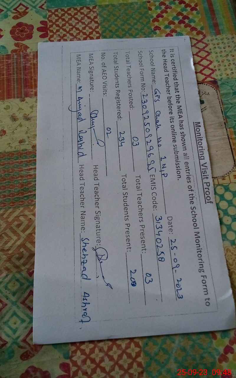| EMIS Code: 31340258 | Name of School: GPS CHAK NO 1/NP | |||