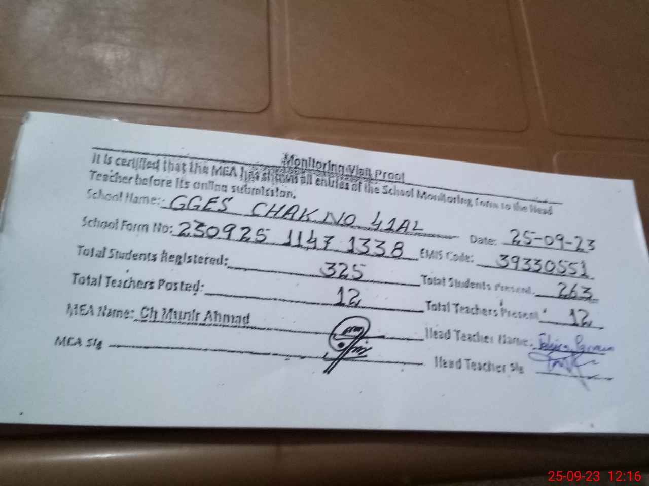 | EMIS Code: 39330551 | Name of School: GGES CHAK 4/1-AL KALAN | |||