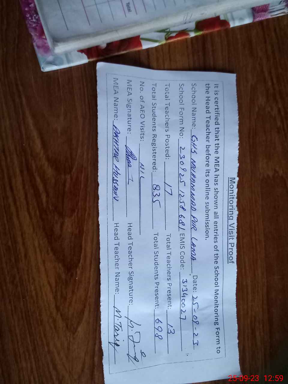 | Attendance Register | Head Teacher | MEA with School | Visit Proof |