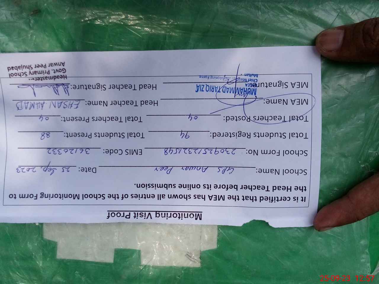 | Attendance Register | Head Teacher | MEA with School | Visit Proof |