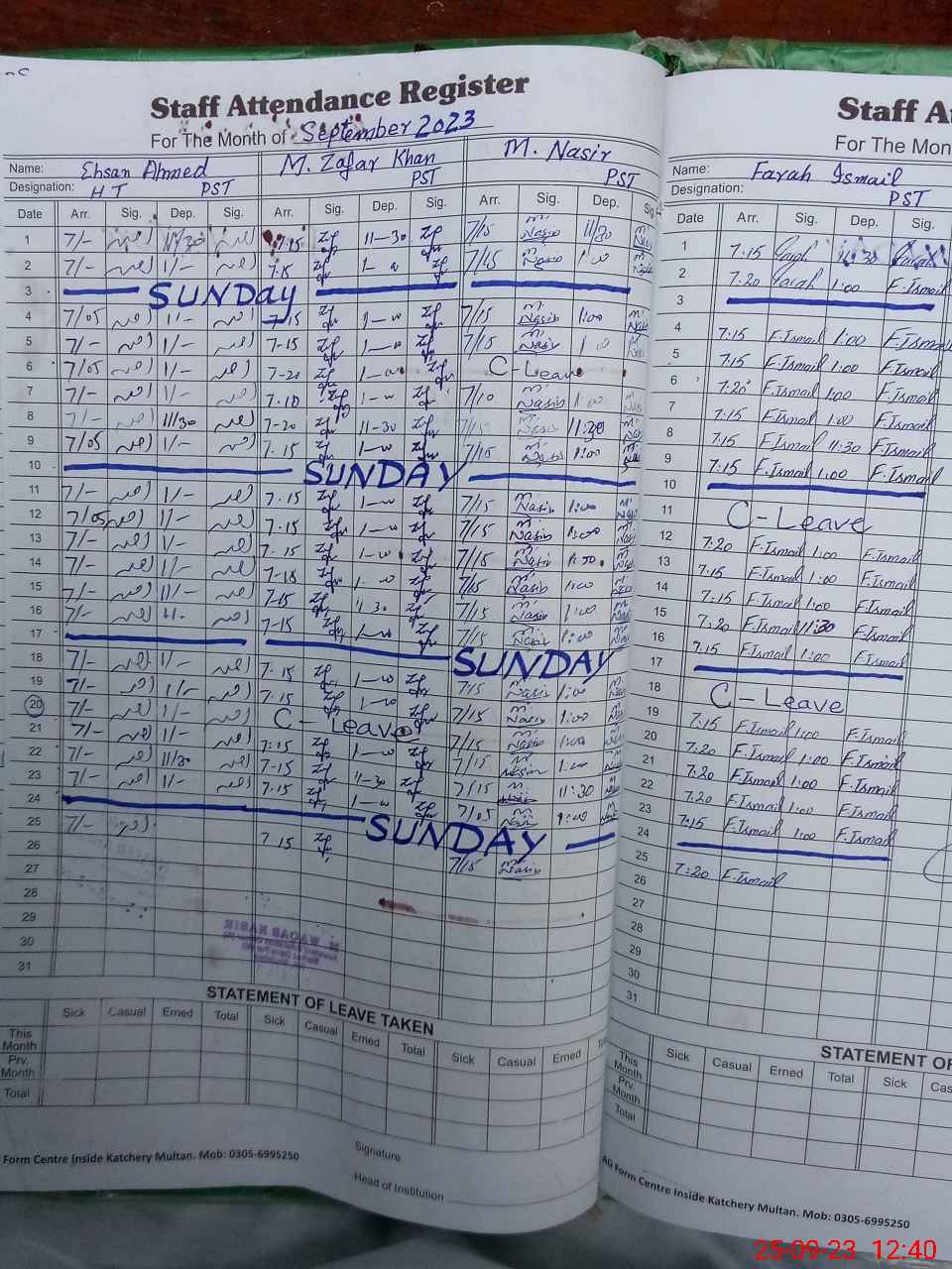 | CNIC | Full Name | Designation | R/C | Absence During Last Calender Month |