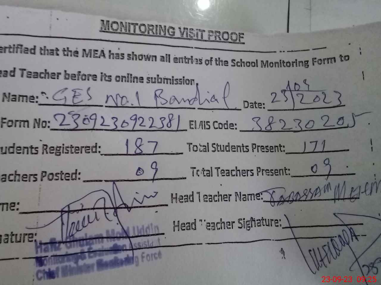 | Attendance Register | Head Teacher | MEA with School | Visit Proof |