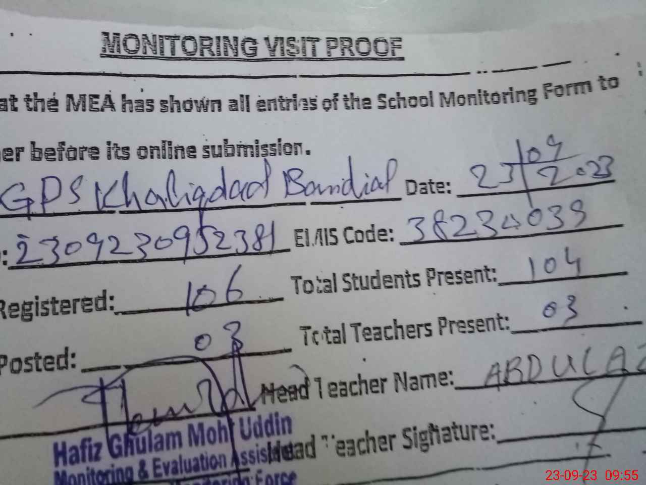 | EMIS Code: 38230039 | Name of School: GPS KHALIQ DAD BANDIAL | |||