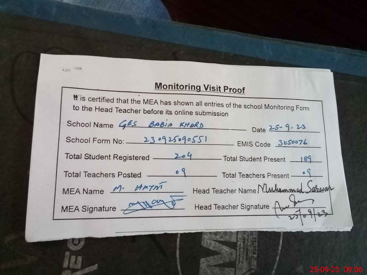 | Attendance Register | Head Teacher | MEA with School | Visit Proof |