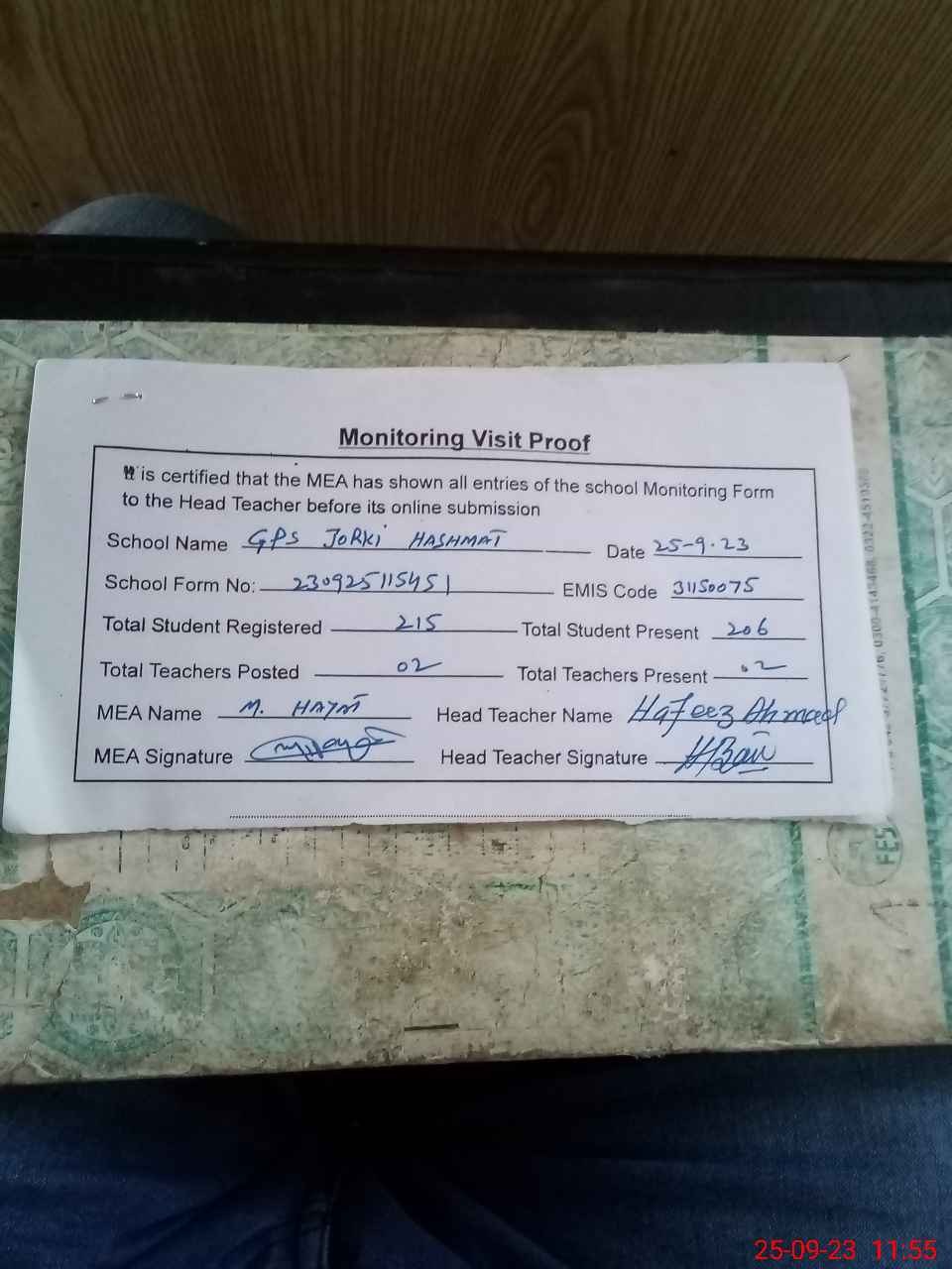 | EMIS Code: 31150075 | Name of School: GPS JORKI HASHMAT | |||