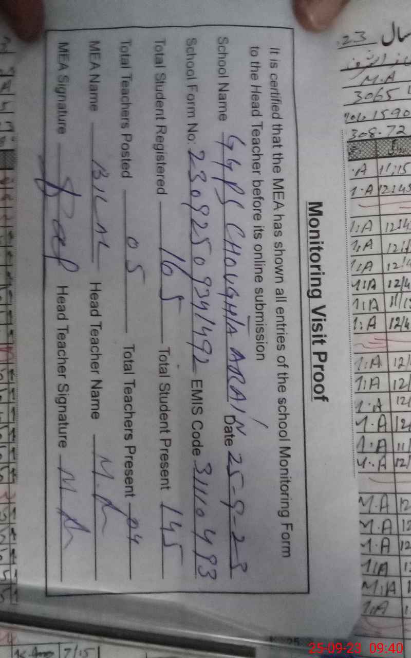 | Attendance Register | Head Teacher | MEA with School | Visit Proof |