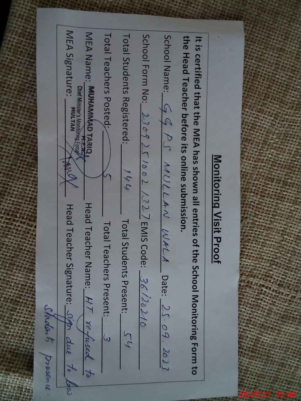 | EMIS Code: 36120210 | Name of School: GGPS MULLAN WALA SHUJABAD | |||