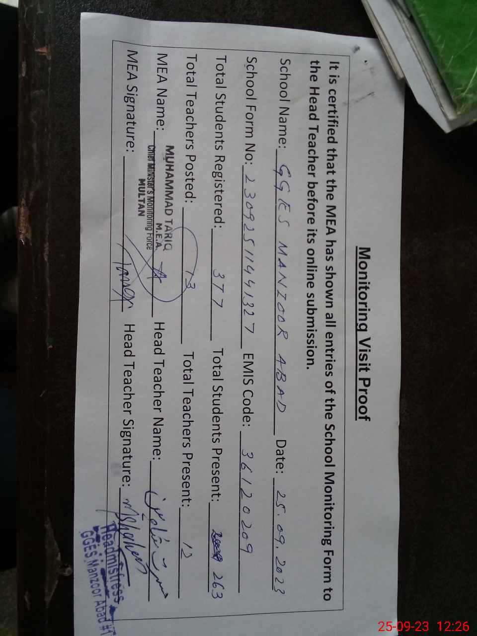 | EMIS Code: 36120209 | Name of School: GGES MANZOOR ABAD NO.1 | |||