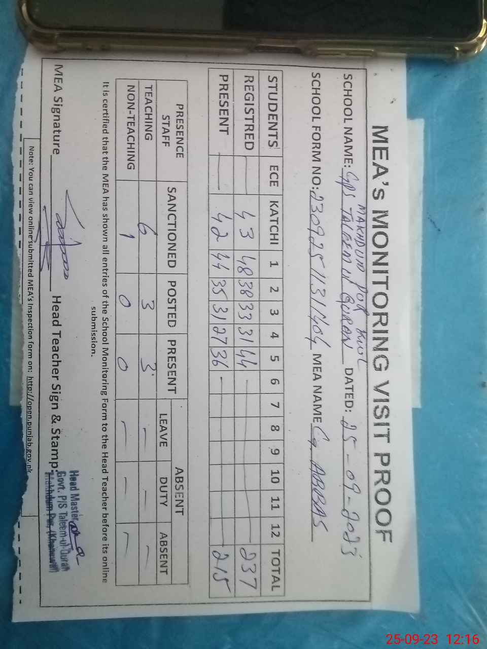 | EMIS Code: 36420149 | Name of School: GPS TALEEM UL QURAN, P/O MAKHDOOM PUR, KHANEWAL | |||