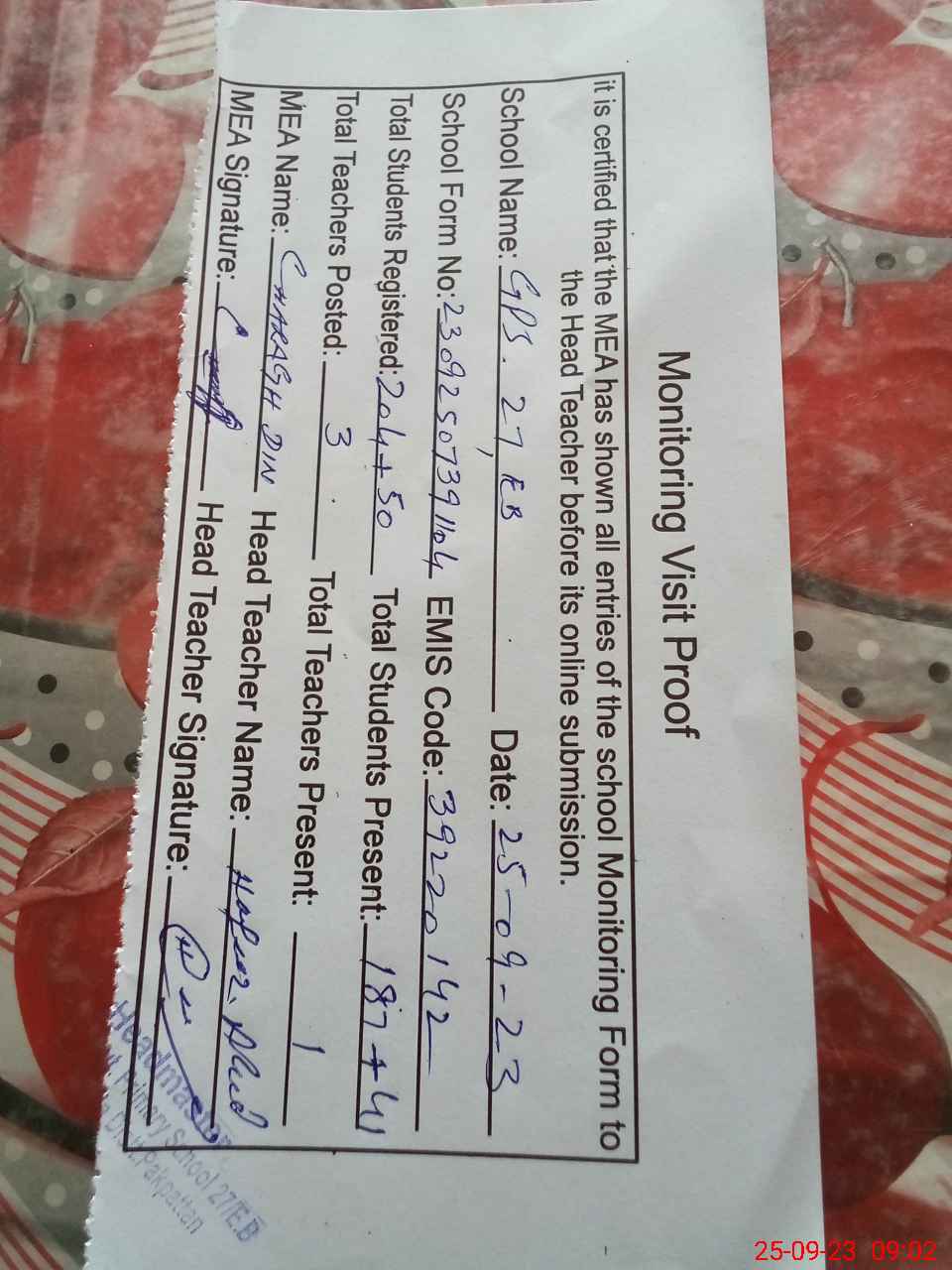 | EMIS Code: 39220142 | Name of School: GPS CHAK NO. 27 EB | |||