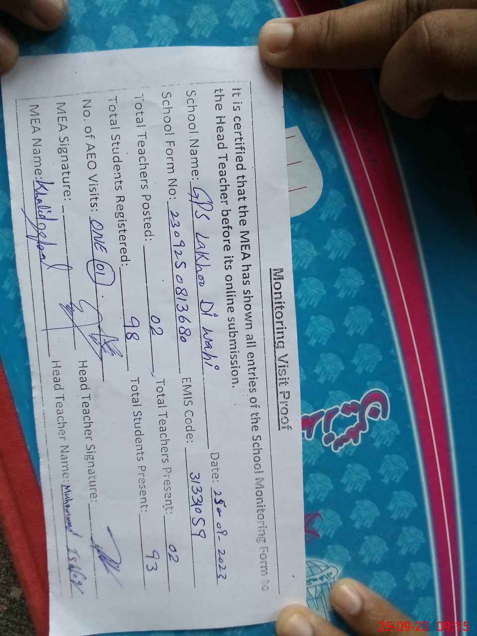 | Attendance Register | Head Teacher | MEA with School | Visit Proof |