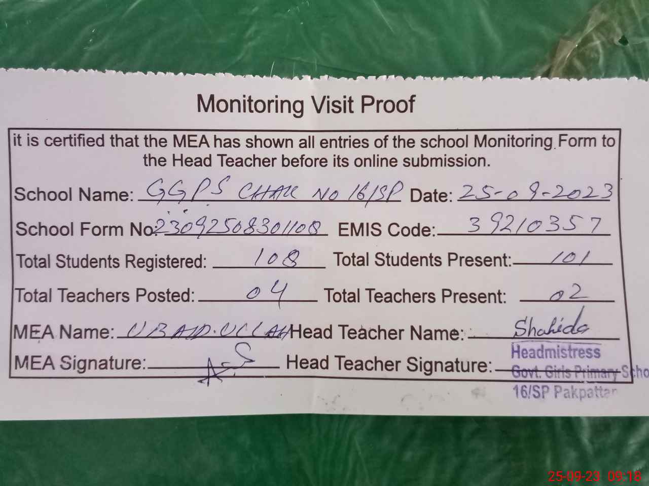 | Attendance Register | Head Teacher | MEA with School | Visit Proof |
