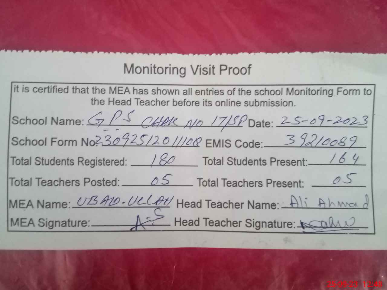 | EMIS Code: 39210089 | Name of School: GPS 17/SP P.O PAKPATTAN | |||