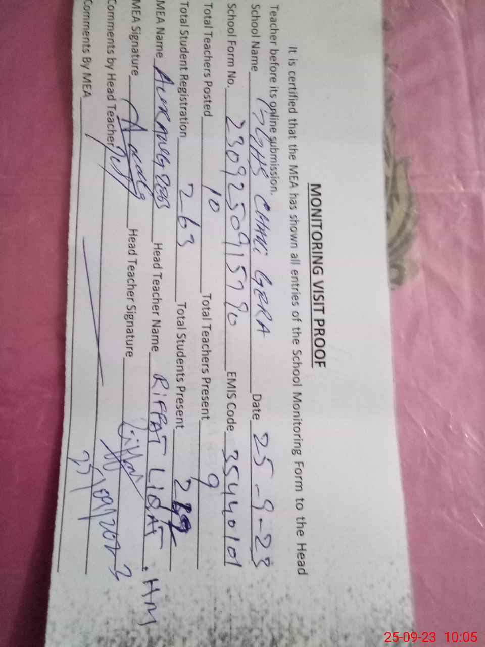 | Attendance Register | Head Teacher | MEA with School | Visit Proof |