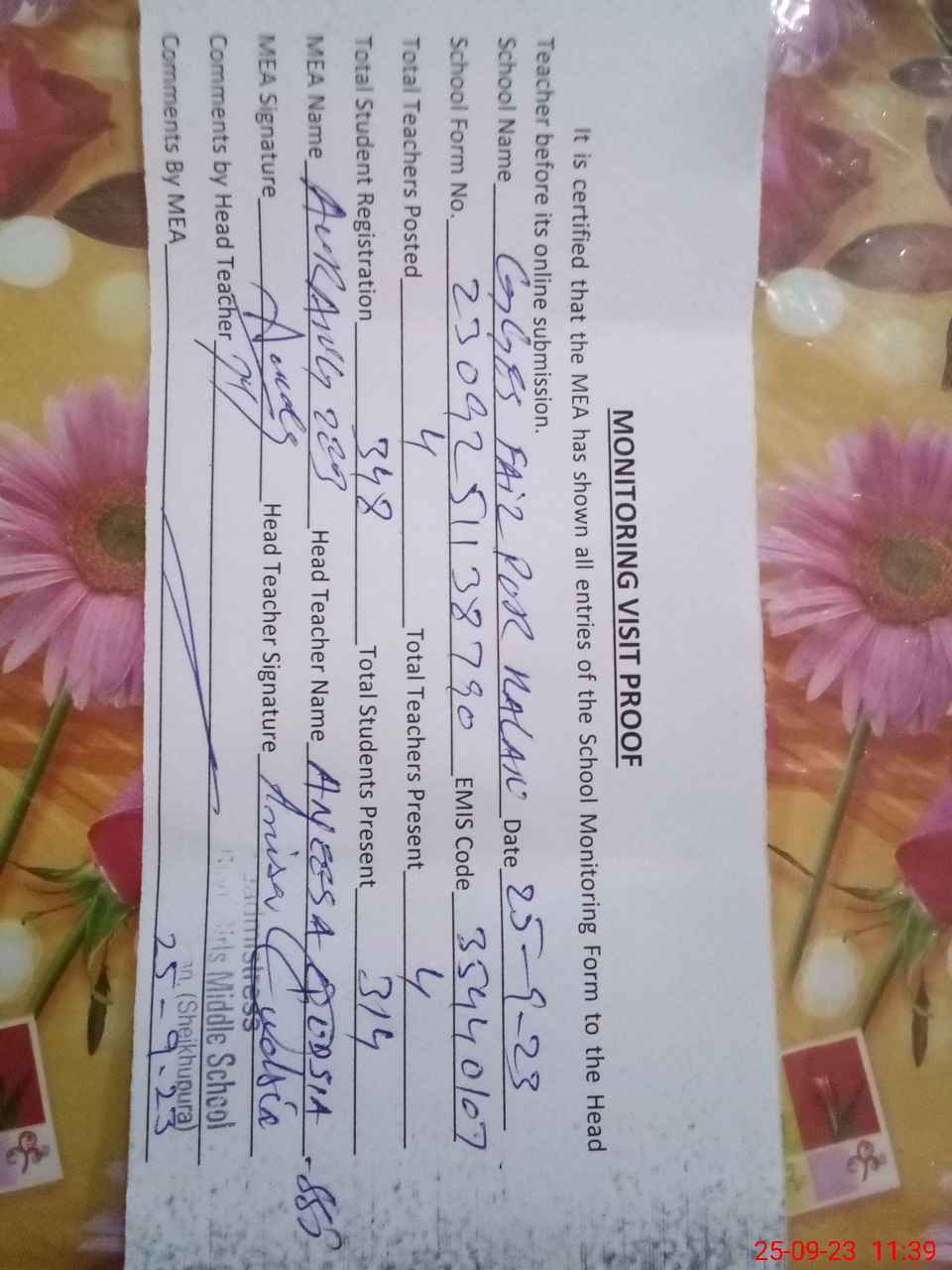 | Attendance Register | Head Teacher | MEA with School | Visit Proof |
