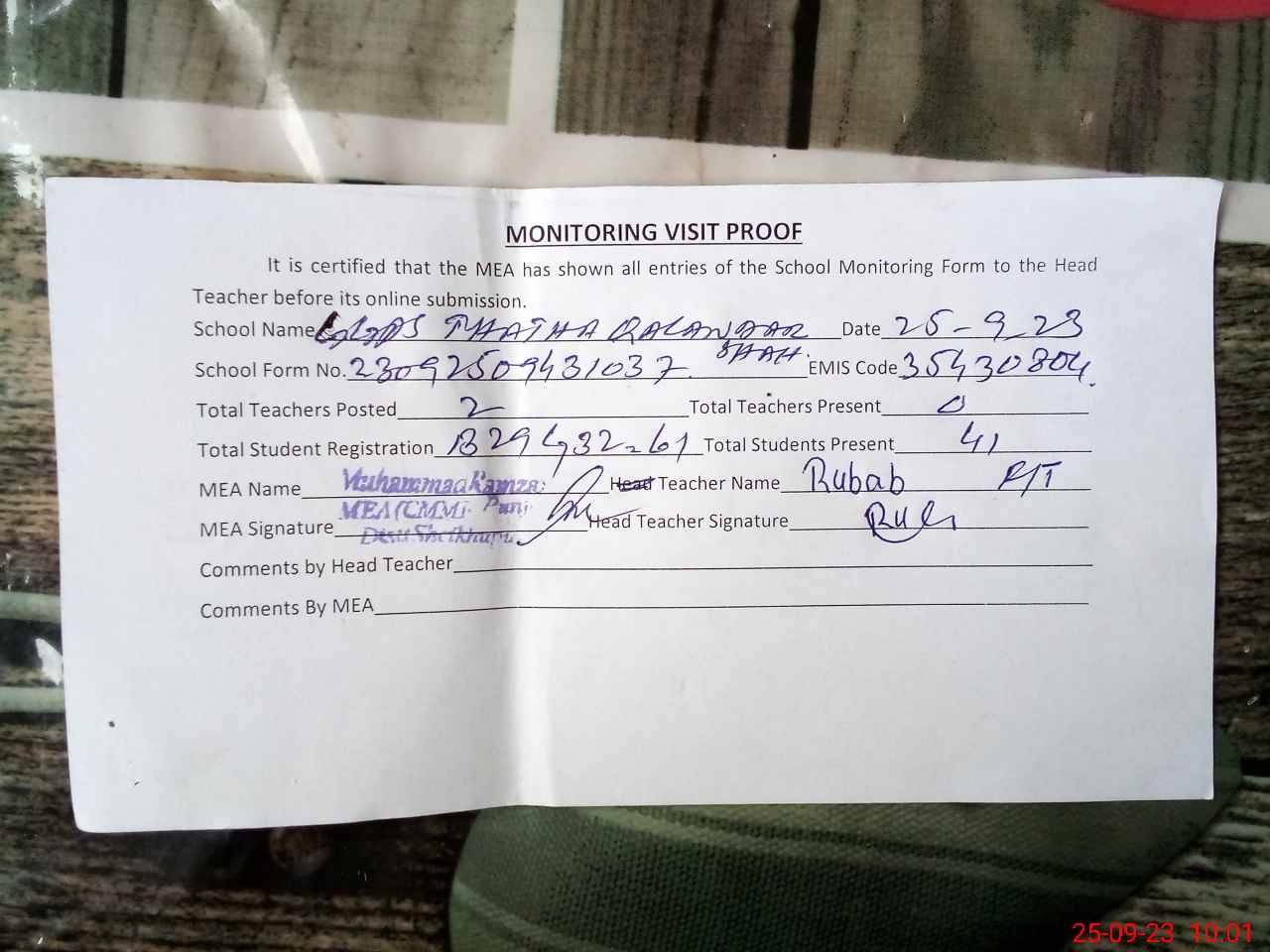 | Attendance Register | Head Teacher | MEA with School | Visit Proof |