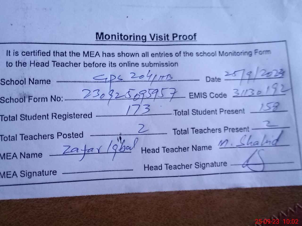 | Monitoring Date: 25-09-2023 | Start Time: 25-09-2023 09:52 AM | End Time: 25-09-2023 10:02 AM | Name of MEA: Za**** Iq**** BN**** | |