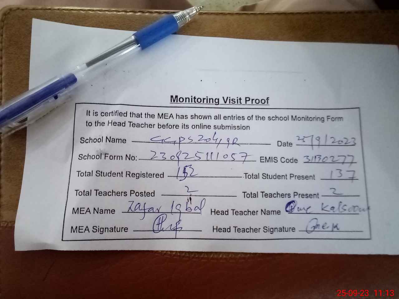 | Attendance Register | Head Teacher | MEA with School | Visit Proof |