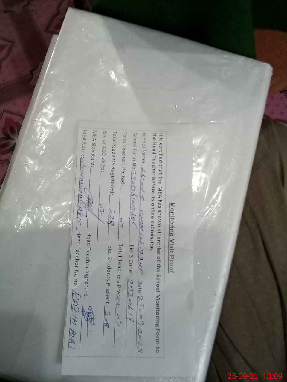 | Attendance Register | Head Teacher | MEA with School | Visit Proof |