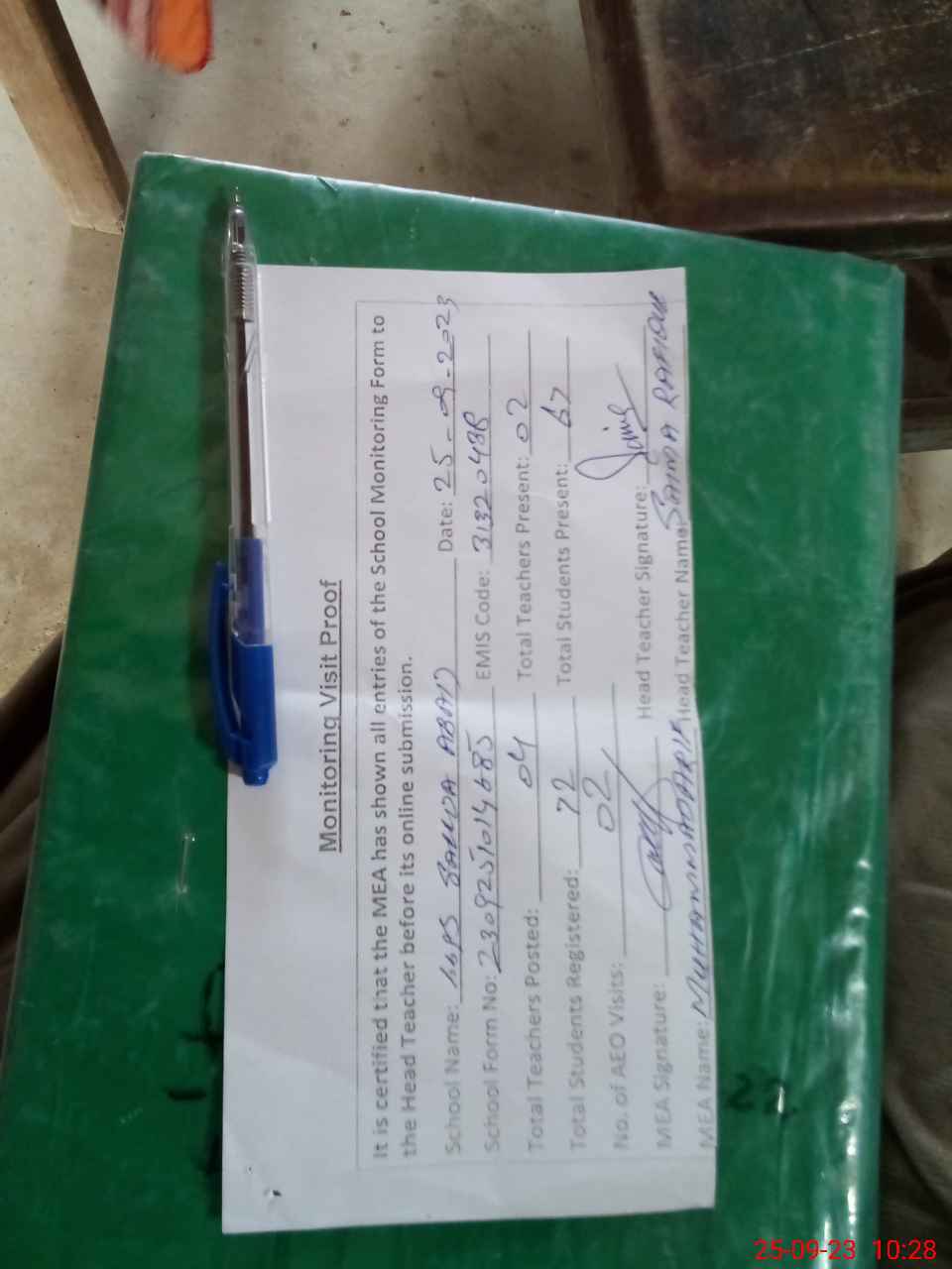 | Attendance Register | Head Teacher | MEA with School | Visit Proof |