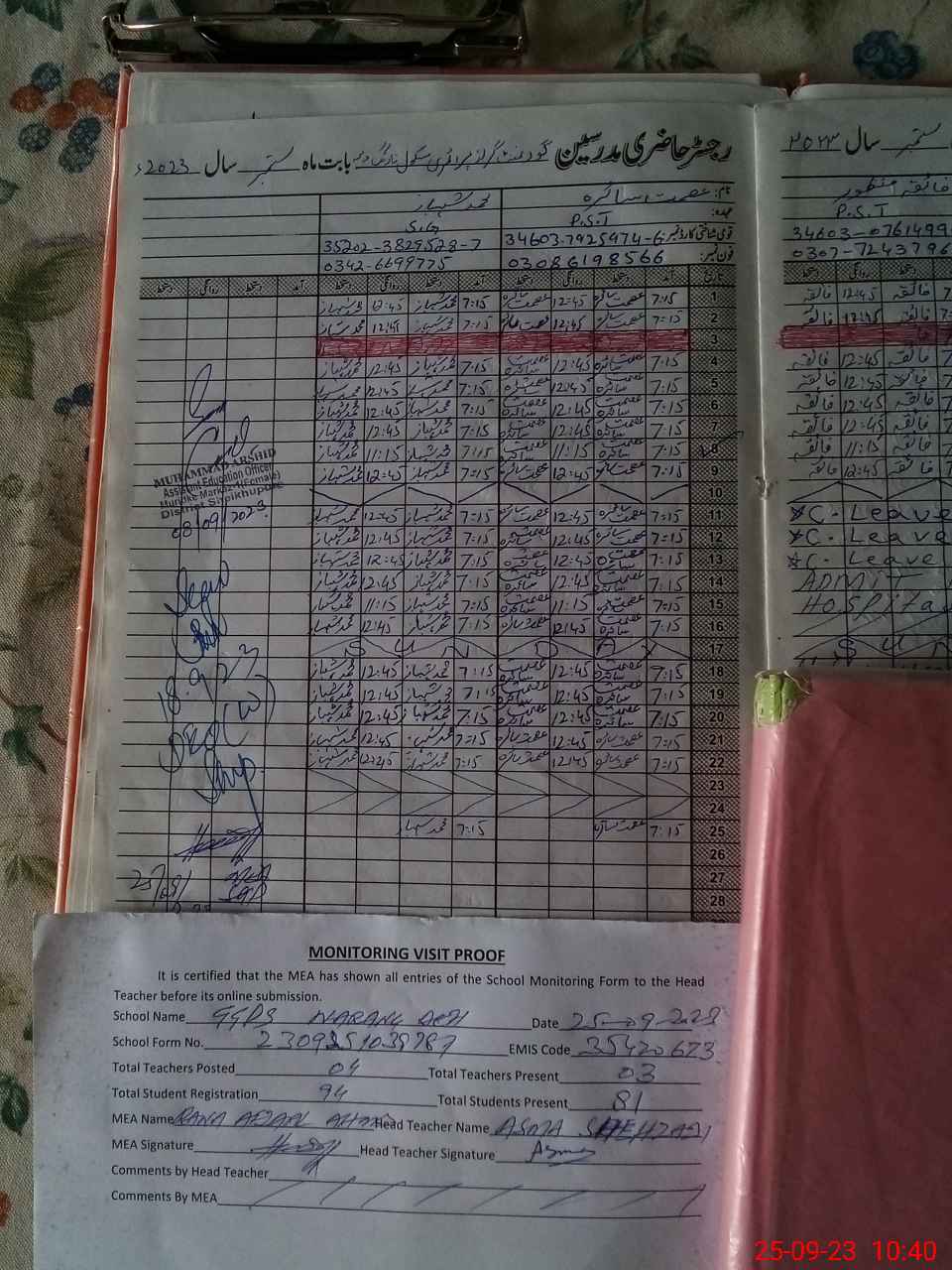 | Attendance Register | Head Teacher | MEA with School | Visit Proof |