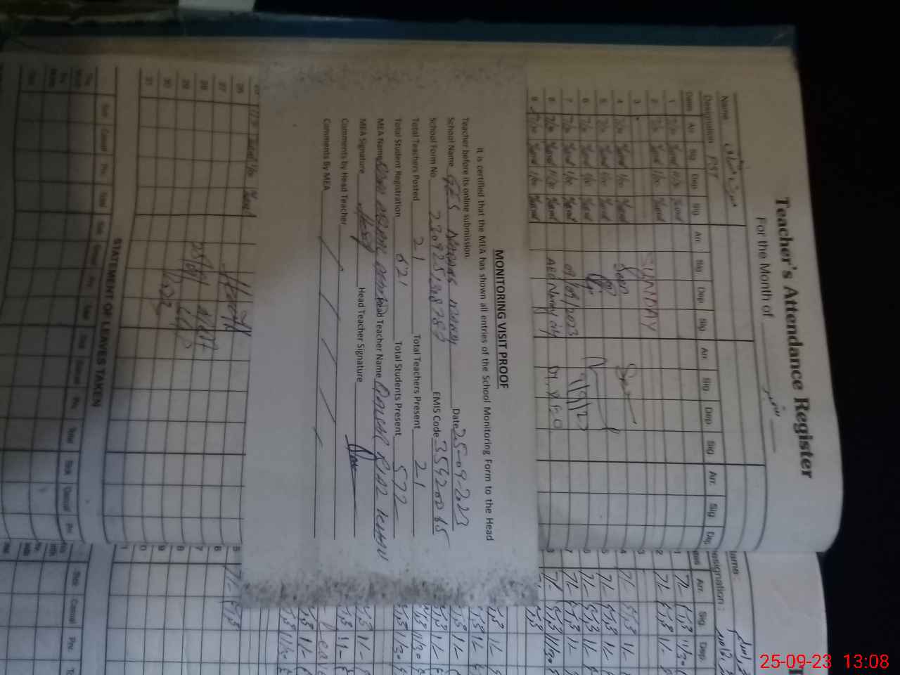 | Attendance Register | Head Teacher | MEA with School | Visit Proof |