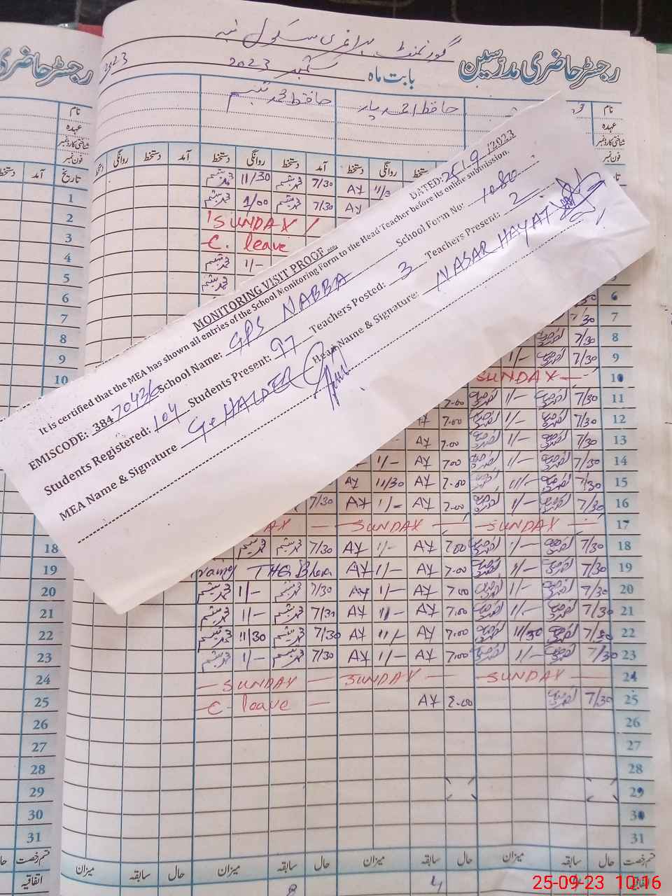 | Attendance Register | Head Teacher | MEA with School | Visit Proof |