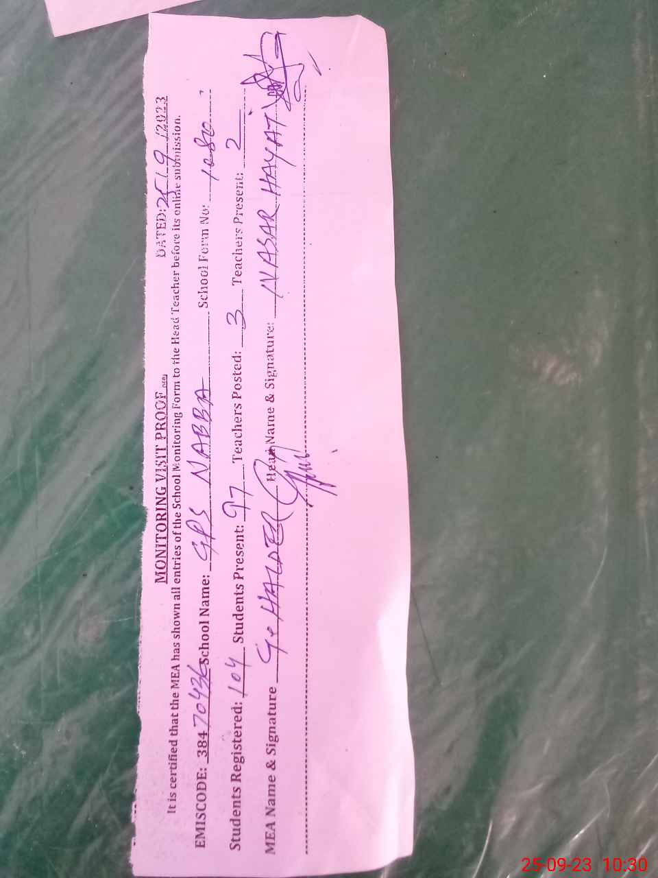 | Monitoring Date: 25-09-2023 | Start Time: 25-09-2023 09:54 AM | End Time: 25-09-2023 10:36 AM | Name of MEA: GH**** HA**** | |