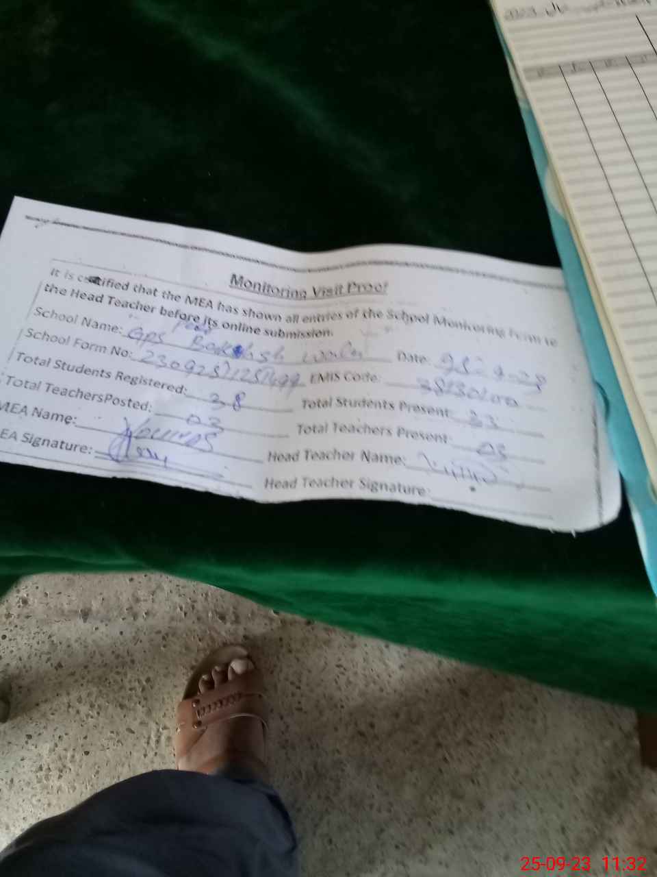 | Attendance Register | Head Teacher | MEA with School | Visit Proof |