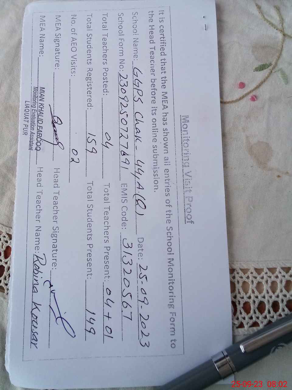 | EMIS Code: 31320567 | Name of School: GGPS CHAK 44/A QADEEM | |||