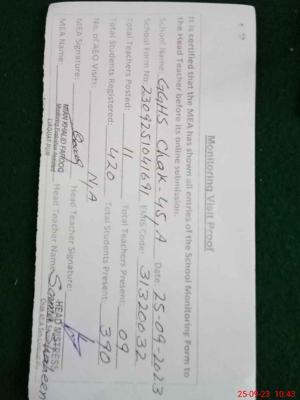 | Attendance Register | Head Teacher | MEA with School | Visit Proof |