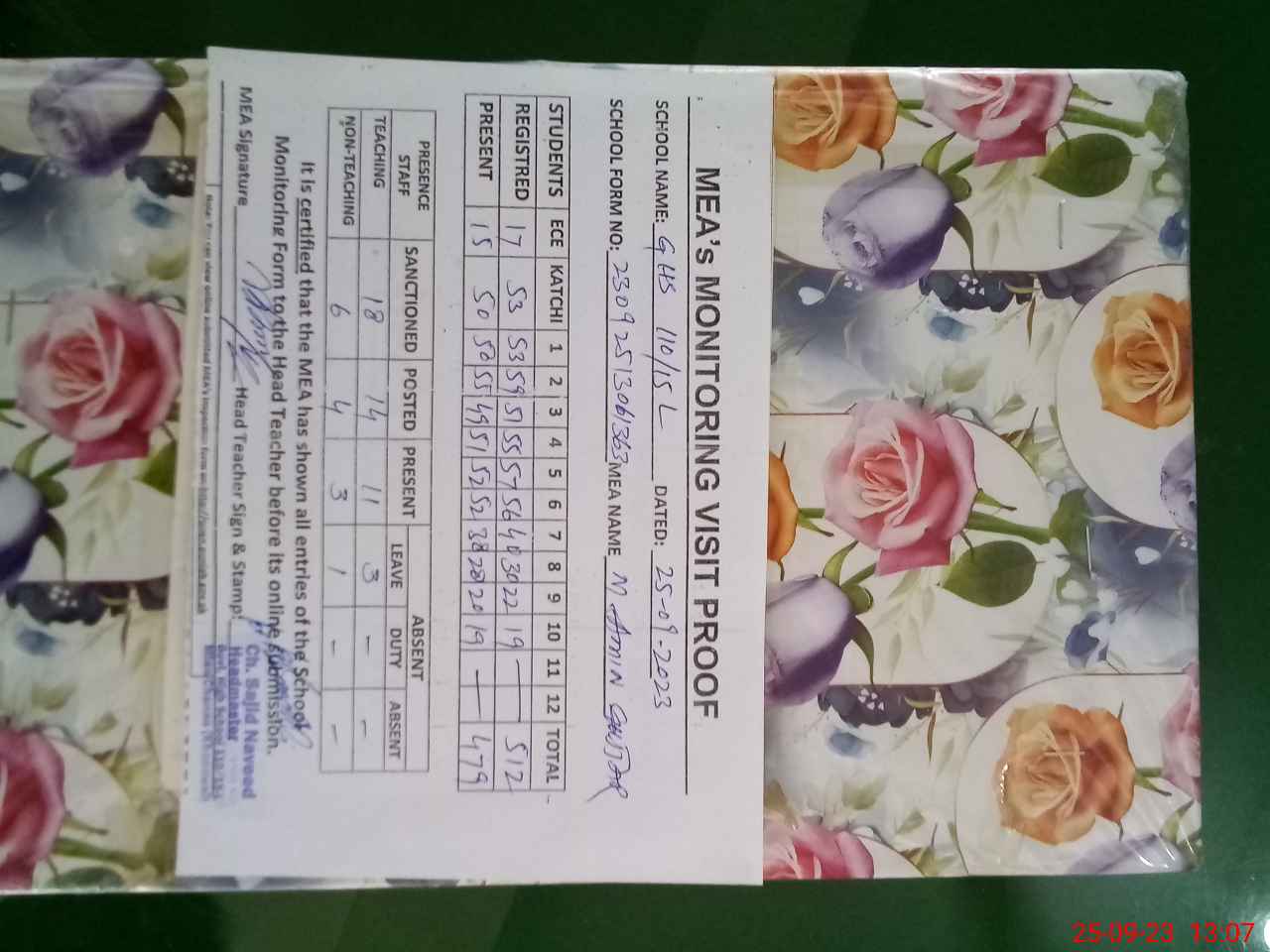 | Attendance Register | Head Teacher | MEA with School | Visit Proof |