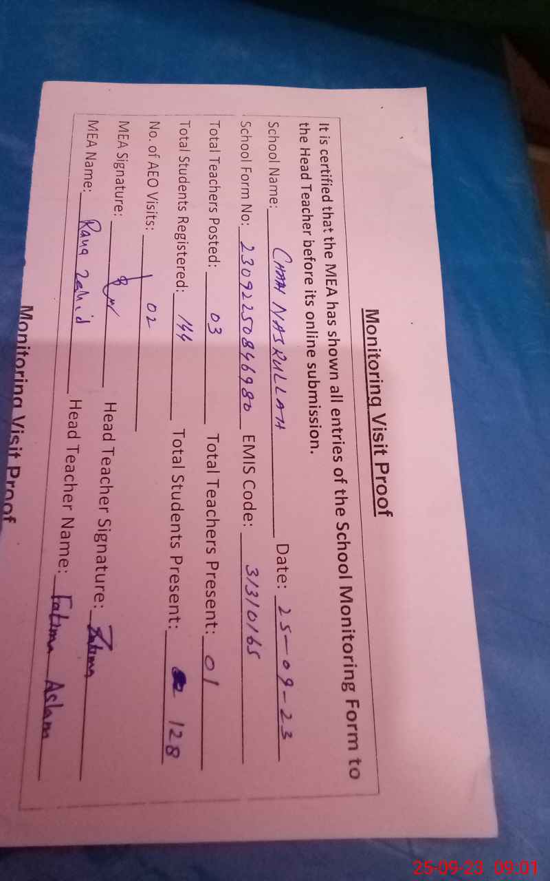 | Attendance Register | Head Teacher | MEA with School | Visit Proof |
