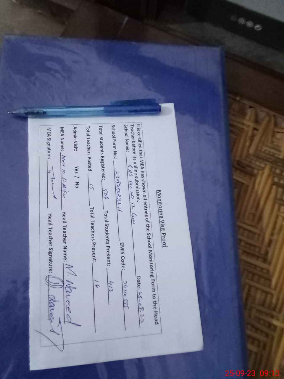 | Attendance Register | Head Teacher | MEA with School | Visit Proof |