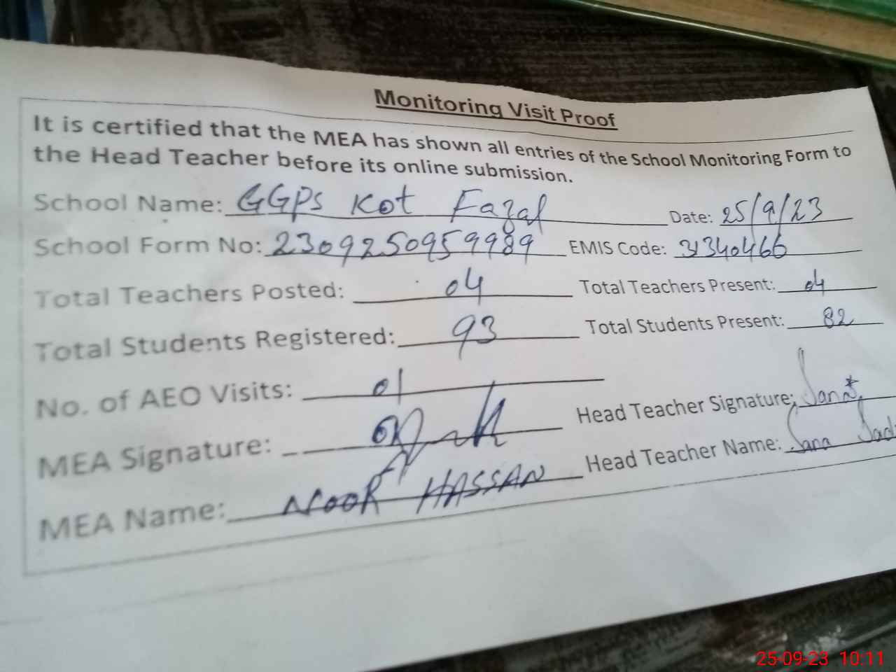 | Attendance Register | Head Teacher | MEA with School | Visit Proof |