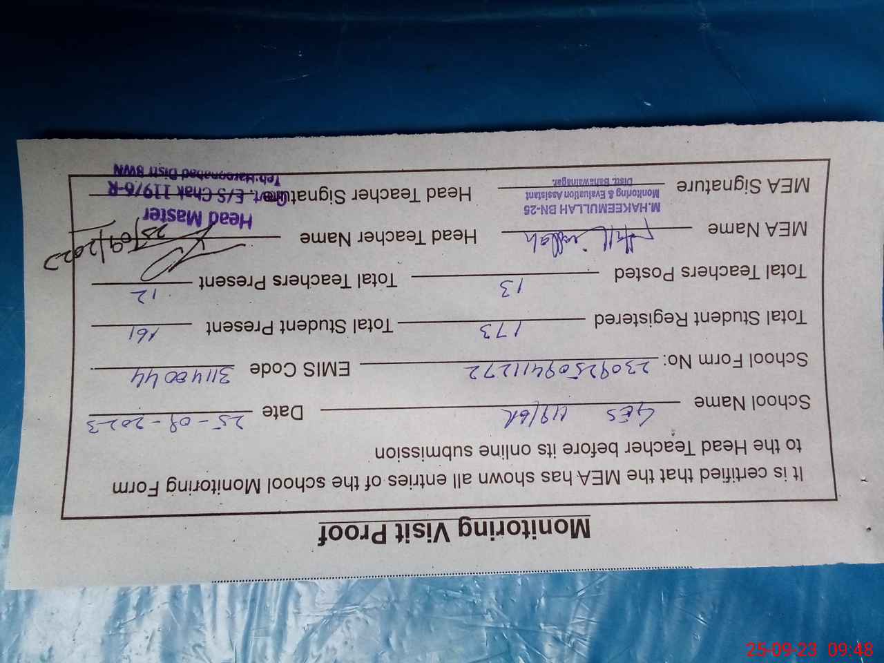 | Attendance Register | Head Teacher | MEA with School | Visit Proof |