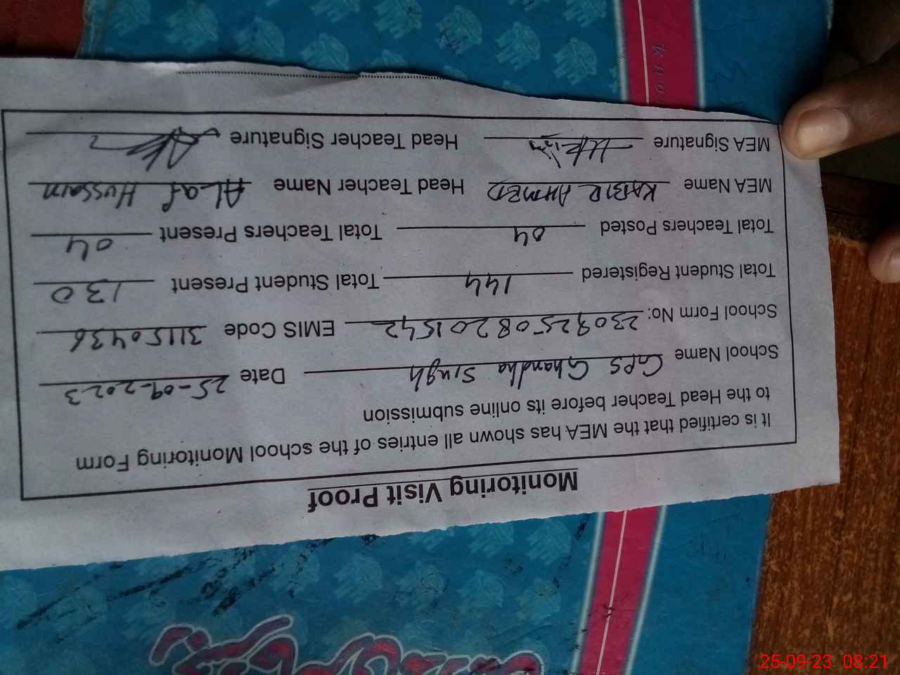 | Attendance Register | Head Teacher | MEA with School | Visit Proof |