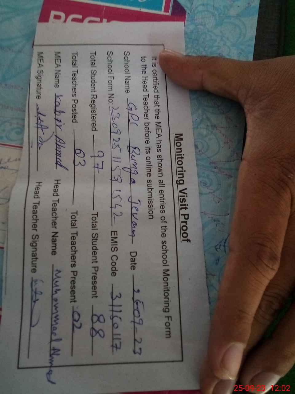 | Attendance Register | Head Teacher | MEA with School | Visit Proof |