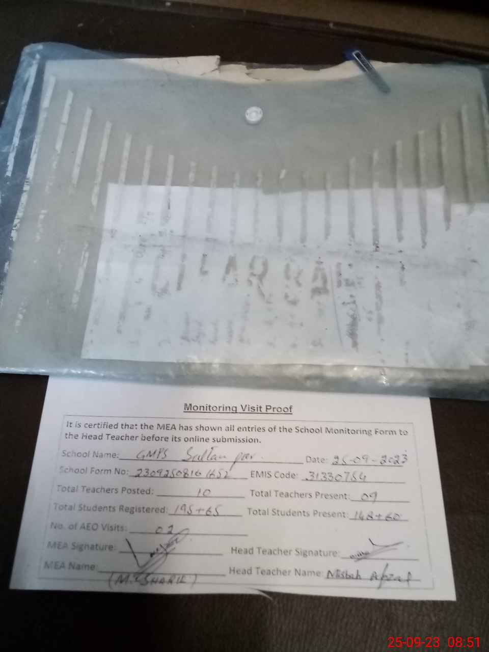 | Attendance Register | Head Teacher | MEA with School | Visit Proof |