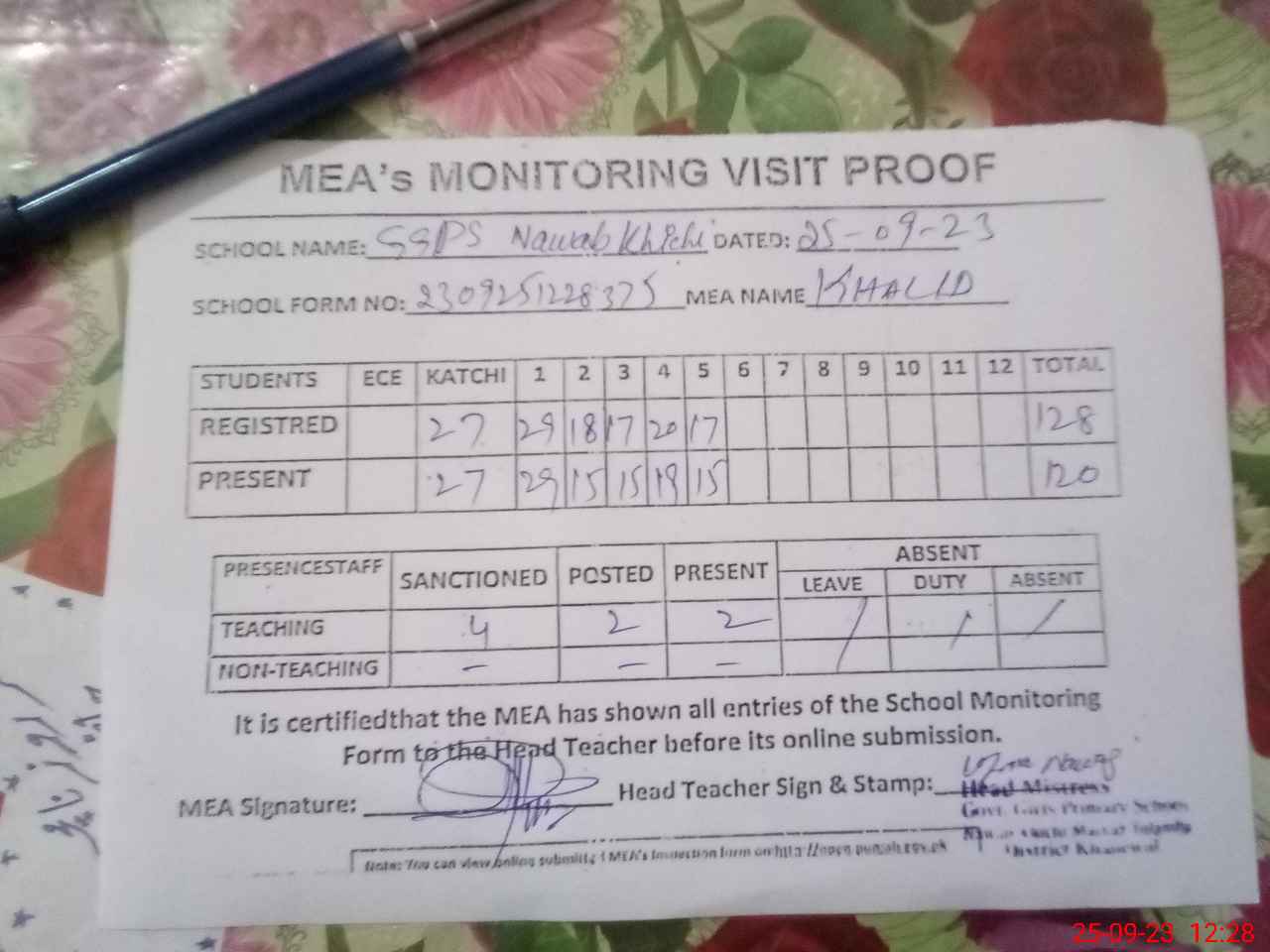 | Attendance Register | Head Teacher | MEA with School | Visit Proof |