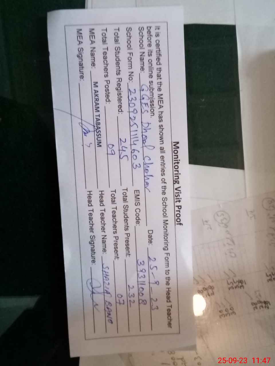 | Attendance Register | Head Teacher | MEA with School | Visit Proof |
